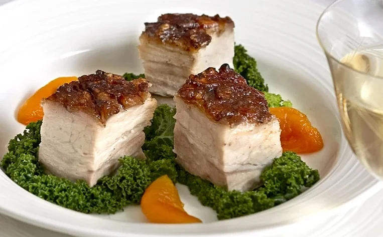 5. Plate each pork belly square on a single leaf and place apricot halves between pork.